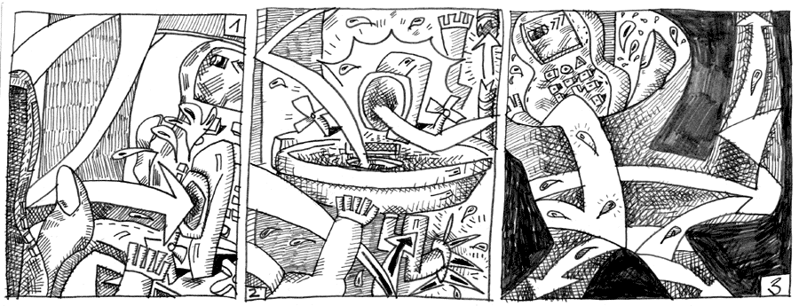 (34 / 281) Unfaßbar! Der Strom-Stoß ist noch lange nicht am Ziel. Hendy wird Zeuge von einem noch nicht dagewesenen Natur-Vorgang. Das grelle Licht macht ihn fast blind. Die elektrische Strom verteilt sich in der Wasserleitung in zwei Richtungen. In der einen Richtung jagt er mit der Strömung durch die Kanalisation. Dabei gelangt er in den Flutkanal. In der anderen Richtung schießt der elektrische Strom gegen die Strömung . Er scheint der Quelle in den Everywener Bergen entgegen zu streben. Aber es passiert noch mehr. Das Wasser teilt sich unter der Einwirkung des Elektro-Schocks in schweres und leichtes Wasser. Was das für Auswirkungen hat, lässt sich den folgenden Bildern entnehmen. |