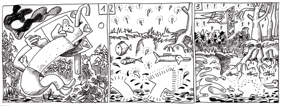 (41 / 281) Kleine Veränderungen am Karten-Segel ermöglichen ein punktgenaues Ankommen. Welcher Landeplatz wäre hier der beste? Der Reli folgt dem Blitz, der sich nach seinem Einschlag in ein Elms-Feuer verwandelt hat und jetzt auf friedliche Art die Erinnerungen an Everywen wachhält. Mit dem Folgenden hatte Niemand rechnen können, auch der Reli nicht, den das tagelange Fasten in eine visionären Verfassung versetzt. Die Heftigkeit des Einschlags befördert das Wasser in einen vierten Aggregatzustand. Neben dem gefrorenen, dem flüssigen und dem gasförmigen Zustand stossen wir auch noch auf den Zustand der Schwer-und- Leicht-Wasser-Trennung. In Lichtgeschwindigkeit stellen sich Veränderungen ein, die der Verstand nicht mehr fasst. Das schwere Wasser drückt sich derartig dicht gegen den Fluß-Boden, daß über ihm ein Zustand herrscht, der bisher noch nirgendwo beobachtet wurde, die massive Un-Vorhandenheit. Das leichte Wasser, das leichter als Wasserdampf ist, verschwindet in der Höhe. In dem Raum, der sich nun zwischen der Leicht-und der Schwer-Wasser-Ebene öffnet, zappeln hilflos die Fische. Die Fließrichtung des Flusses kehrt sich um. Das Wasser aus dem Unterlauf drückt in die Schwerwasser-Mulde. |