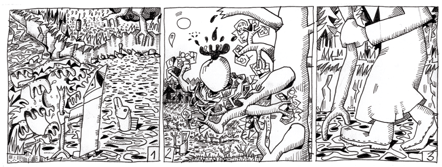 (43 / 281) In Richtung Quelle scheint der ganze Oberlauf nur noch mit schwerem Wasser gefüllt zu sein. Voller Hoffnung sehen die Fische dem leichten Wasser entgegen, das aus dem Unterlauf in die massive Un-Vorhandenheit strömt. Doch der Trenn-Prozess hört nicht auf, gleichwohl bildet sich durch den Zustrom frischen Normal-Wassers eine relativ günstige Überlebens-Lage. Ihr braucht also um die Fische keine Angst zu haben. Der Reli braucht kein schlechtes Gewissen zu haben, wenn er die Fische jetzt alleine lässt. Er will weiterwandern. Er behält er den abgebrochenen Ast als Wanderstab. Unter der Bruchstelle oben im Baum befindet sich ein Nest. Schweres Wasser tropft auf das Ei, das darin liegt. Ein berauschendes Hochgefühl erfüllt den Reli. Über`s Wasser gehen! Wer hat davon nicht schon einmal geträumt? Schritt für Schritt. Schnell hat er sich daran gewöhnt. Er schreitet entschlossen stromauf. |