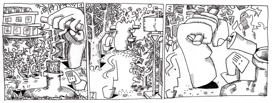 (44 / 281) Kurz vor diesen Ereignissen haben Melo und seine neue Bekanntschaft, die Linke Hand, von derem Tun die Rechte nichts weiß, einen Weg auf der Rückseite des Schulgebäudes gesucht. Offenbar ist vor ihnen noch Niemand auf diese Idee gekommen. Es gibt keine Spuren. Melo und die Linke Hand sind Pioniere in einem verwilderten Gelände. Als ihnen die Korken-Zieher- Klippe das Weitergehen verbietet und sie bereits aufgeben wollen, machten sie eine überraschende Entdeckung. Zwei Schritte neben ihrem Weg ragt eine Flasche aus dem Boden. Sie ist verkorkt. Was machen? Der Entdecker-Geist duldet keinen Aufschub. Das korken-zieher-förmige Kreuz auf der Klippe wird zweckentfremdet. Plopp! Melo und die Linke Hand sind so in ihre Tätigkeit vertieft, daß sie nicht merken, wie sich eine dritte Person zu ihnen gesellt. Es ist Hier-soll-es-schön sein. |