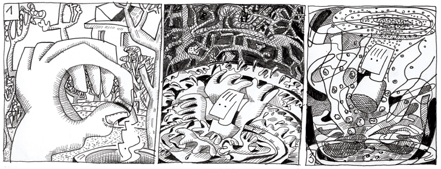 (46 / 281) Das hatte Hier-soll-es-schön-sein nicht gewollt. Er könnte sich ohrfeigen. Aber die Linke Hand weiß etwas Besseres. „Erstmal die Lage erkunden“, sagt sie, „ich halte Dich hinein“. Aus der Dunkelheit dringt ein Platschen nach oben. Wenigstens war die Landung weich. Aber was weiter? Das weiß so schnell Niemand. Der Sturz ist auch noch nicht zuende. Denn die Wucht seines Sturzes lässt Melo bis auf den Grund durchschlagen. Melo schluckt Wasser. Ist das wirklich Wasser? Es schmeckt eigenartig. Nein! Das ist kein Wasser. Was Ihr nicht sehen könnt, liebe Kinder, weil das hier ein Schwarz-Weiß-Bild ist: die Flüssigkeit ist dunkelrot. |