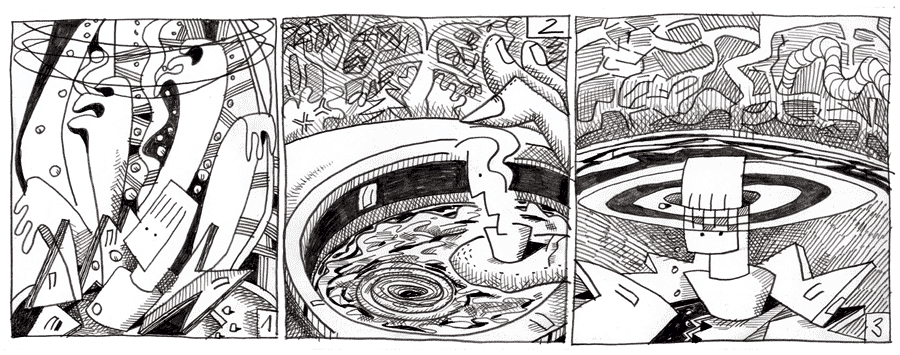 (47 / 281) Melo schlägt auf dem Grund hart auf. Der Boden unter ihm zersplittert. Hier-soll-es-schön-sein und die Linke Hand stehen wie versteinert auf dem Rand. Sie starren in die Finsternis. Hoffentlich kommt bald ein neues Lebenszeichen. Da! Es ist ein Gurgeln. Die Flüssigkeit, die die große Flasche bis zur Hälfte gefüllt hatte, fließt aus. Durchhalten Melo! Gleich kommst Du wieder an die Luft! |