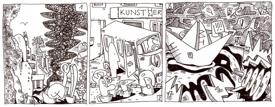 (57 / 281) Kurz nach 6.30 Uhr verschwindet die Bohrmaschine im Berg. Plötzlich scheint der Berg zu brennen. Die Wolken, die den Tunnel verlassen, verdüstern den Himmel über der Stadt. In der Ganze-Satz-Strasse Nr 6 verlässt man wie jeden Morgen das Haus. Allerdings fehlen die Knaben. Vulkana sitzt am Steuer. No-Nein und Hier-wohne-ich sollen in die Schule gebracht werden. Anschließend wollen sich die Ältern auf die Suche nach den Knaben machen. BooRRRRoooRRR. Der Bohrer ist bis in die Flaschen-Grotte duchgestoßen. Melo hat sich aus dem Blatt Papier ein Schiff gebaut. |