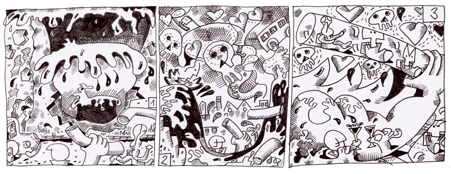 (59 / 281) Auf dem Bild könnt Ihr nocheinmal sehen, wie die Veritas-Wasser-Welle zuschlägt. Sie schlägt über Vulkana, Woo-Fi, No-nein und Hier-wohne-ich zusammen und reißt sie mit. Gleichzeitig seht Ihr viele Fleissige Hände, die Röhren heranbringen, um die Quelle zu verrohren. Allerdings wird daraus erstmal nichts, weil man die Wucht des herauskommenden Wasser unterschätzt hat. Auch die Wirkung auf das Zentral-Nervensystem kommt völlig unerwartet. So turbulent auch die Gesamtlage ist, unter dem Einfluß der Veritas-Dämpfe halten sich Gut und Schlecht die Waage. Das setzt den Blick für Visionen frei, die man gewöhnlich für unmöglich halten würde. Jetzt fährt auch Hier-soll-es-schön-sein auf einer Flaschen-Scherbe Wasser-Ski. Der Traum vom Kurort verflüchtigt sich. Statt Kur-Ort Sport. Der OB und die Rechte Hand stossen auf die gute Idee an. Sie werden mit den Röhren eine Rat-Haus-Umgehung für die Kids bauen, die Every-Wener Rutsche. |