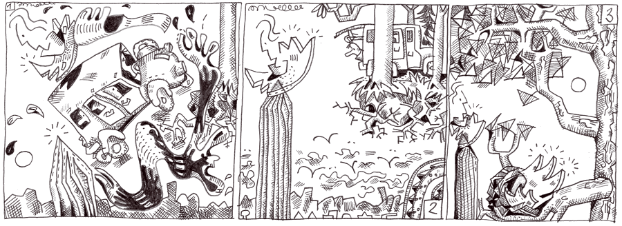(65 / 281) Hoppla! Die Welle schlägt gegen einen Baum. Sie prallt ab und wirft Hier-soll-es-schön-sein zurück, während der Bus wieder festen Boden unter seine Reifen bekommt. Das war haargenau! Auf diese Weise könnten noch mehrere auf der Nagel-Spitze Platz nehmen. Aber wie kommt der Junge weiter? Merkwürdig! War der Nagel vorhin nicht kürzer? Sinkt etwa die Insel. Wenn sich der Betrachter an der Brücke orientiert, merkt er, daß es an dem Nagel liegt. Der Nagel schiebt sich mit andauernder Stetigkeit aus der Erde heraus. Was geht vor sich? Wird es eine Rettung für Hier-soll-es-schön-sein geben? Am Himmel kringelt sich die Abgas-Fahne der Bohrmaschine. |