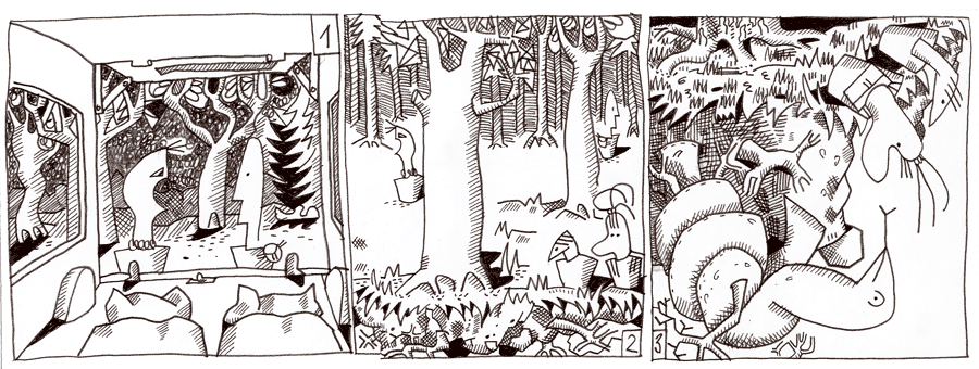 (69 / 281) Ausgeflogen! Das ist keine gute Überraschung. Die Ältern durchstreifen besorgt den Wald. Da! Die Mädchen stehen an der Kante und sehen hinunter in die Tiefe. Den Ältern stockt der Atem. Die Kleinen legen sie sich auch noch auf den Boden, um ihren Kopf über die Kante stecken zu können. Jetzt ist alles klar. Liberty muß bei der Lanung aus der Heckklappe gefallen sein. Sie hält sich an den Wurzeln des schwebenden Waldes fest. Wir helfen Dir, rufen die Mädchen der Schlange zu. Aber wie? |