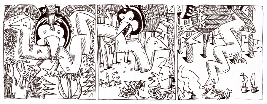(71 / 281) Die Schwamsel trägt ihre Beute über die Baumwipfel hinweg. Auf dem Waldboden eilen die vier Everywener ihr hinterher. Sie ahnen, was das Tier will. Die Schwamsel, die elternlos aufgewachsen ist und alles selber herausfinden muß, will ihr Küken füttern. Wss sie für einen Wurm hält, ist natürlich viel zu groß. Hier-soll-es-schön-sein sperrt vor Überraschung seinen Mund auf. Der Vogel meint, daß alles in Ordnung ist. Er reicht dem Jungen das vermeintliche Futter und macht gleich wieder kehrt, um mehr zu holen. Liberty ist frei. Schnell schließt Hier-soll-es-schön-sein den Mund. |