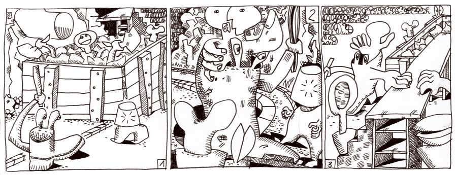 (75 / 281) Für den Staatsstiefel ist der Fall klar. Ohne viel zu überlegen gibt er zu verstehen: „Das geht nicht!“ Wie gut, daß es den Strär gibt! „Jetzt überlegen Sie doch einmal, Herr Wachtmeister,“ sagt er, „sind Sie nie jung gewesen?“ Das weckt auch im Staatsstiefel das Kind im Manne, Dakma, und er gibt sich geschlagen. Mehr noch, er findet den Vorschlag der Neuen überzeugend, das Sprungbrett zu entfernen. „Wegen Gefahr in Verzug“, sagt der Strär. Und so heißt es auch in der Amtssprache. Der Staatsstiefel ist dem Strär für den Vorschlag sehr dankbar. Das gefährliche Sprung- Brett soll seinem Zweck zu entfremdet und in eine einfache Kasten-Abdeckung verwandelt werden. Gemeinsam haben sie die öffentliche Ordnung schnell wieder hergestellt und gehen auseinander. Die Neuen winken vom Kasten aus noch lange hinterher. Was haben sie denn da zu wispern? Was habt Ihr vor! |