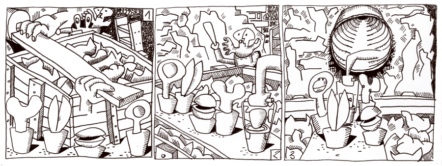 (76 / 281) Der Staatsstiefel ist dem Strär für den Vorschlag sehr dankbar. Das gefährliche Sprung- Brett soll seinem Zweck zu entfremdet und in eine einfache Kasten-Abdeckung verwandelt werden. Gemeinsam haben sie die öffentliche Ordnung schnell wieder hergestellt und gehen auseinander. Die Neuen winken vom Kasten aus noch lange hinterher. Was haben sie denn da zu wispern? Was habt Ihr vor! |