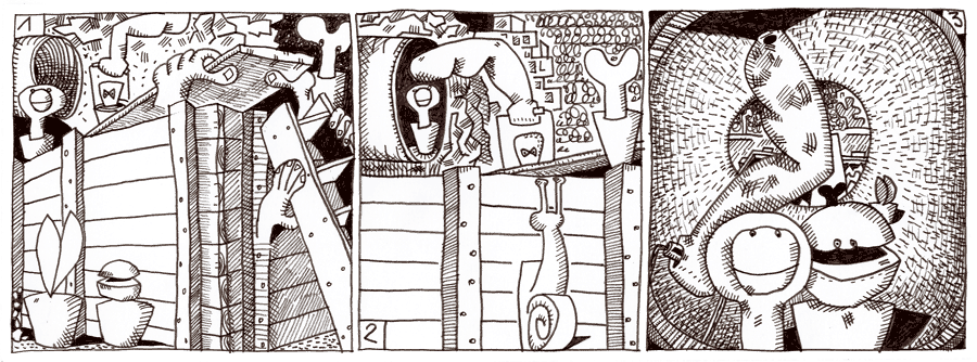 (77 / 281) Alle Handlungen in der Gruppe scheinen sich plötzlich nur noch auf ein Ziel auszurichten, das uns die Neuen aber nicht verraten wollen. Wir müssen raten. Erstens: Warum stellen sie unter das Brett die Leiter, so daß das Brett jetzt schief aufliegt? Zweitens: Was treibt sie in die Röhre? Drittens: Wer geht voran? Viertens ist am leichtesten: Wessen Idee ist das? |
