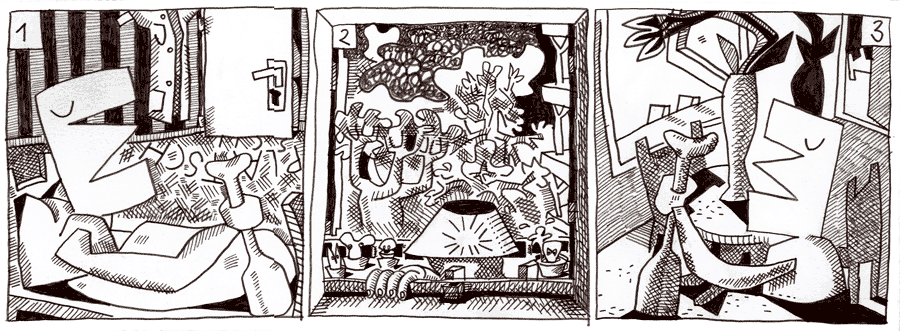 (83 / 281) Ein kleines Platschen nur. Trotzdem erreicht es den By-Pass in seinen tiefsten Träumen. Reflexartig greift dieser zum Paddel. Es ist soweit! Was ist soweit? Hat er den Einbrecher gehört? Wozu das Paddel, soll es ihm als Waffe dienen? Ist By-Pass ein Schlafwandler? Wie auch immer. Einen Augenblick bevor By-Pass das Zimmer betritt, verschwindet der Strär unter der Fensterkante. Etwas nicht in Ordnung? Ach, By-Pass hat ja nicht einmal die Augen auf. Er könnte beruhigt wieder zu Bett gehen. |