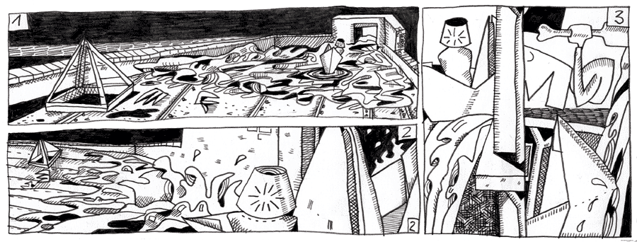 (96 / 281) Ein Blick zurück zeigt ihm, daß es höchste Zeit wird. Das Becken ist leer. Neben der Oberlicht-Pyramide liegen die Wasserpflanzen flach auf dem Boden. Noch einmal gut gegangen. Das letzte Wasser reicht. Es reißt Strärs Boot mit unverminderter Kraft ins Freie. Aber damit, daß er einen Beifahrer bekommt, hat er nicht gerechnet. Mit instinktiver Sicherheit springt By-Pass dem Boot hinterher, das in die Tiefe saust. Nur gut, daß er die Augen zu hat. |