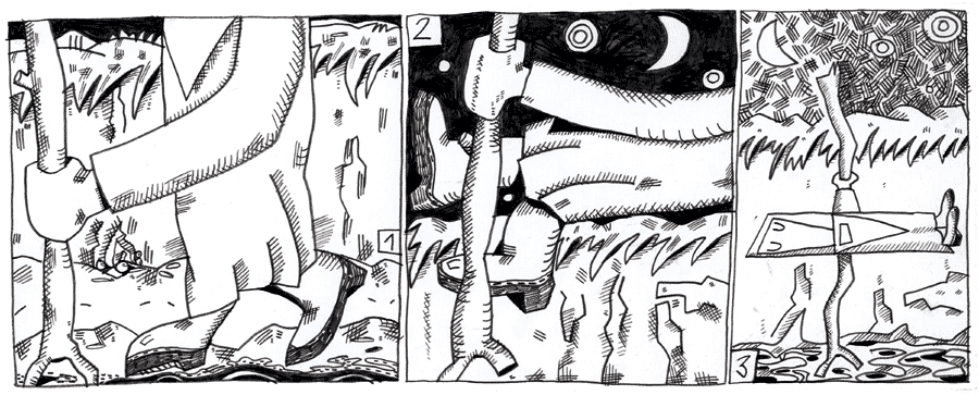 (100 / 281) Den haben manche vielleicht wieder vergessen. Den Reli. Von weitem ist er auch nicht mehr so leicht zu erkennen, weil sein Kennzeichen, der Wanderstab, fehlt. Der ist bei der Landung im schwebenden Wald verloren gegangen. Aber auch auf dem Ast, den er stattdessen verwendet, kann er sich gut abstützen. Seit seiner Landung geht der Reli unentwegt flussaufwärts. Die Spaltung des Wassers in Leicht- und Schwerwasser ist weit vorangeschritten. Man kann auf dem Wasser gehen. Diese Veränderung ist dem Reli in Richtung Quelle vorausgeeilt. Aber nicht nur das Wasser ist tragfähiger geworden. Die Schuhsohlen werden leichter; denn durch die Berührung mit dem schweren Wasser oder genauer gesagt durch die infinitesimale Annäherung an das Schwerwasser verlieren sie jede Schwere, so daß der Reli nicht nur wegen des langen Fastens zu schweben meint. Er schwebt wirklich. Als er müde wird, kann er daher im Flußbett wie in Abrahams Schoß schlafen. Auch hier sieht man, daß der Ast ein guter Tausch war. |