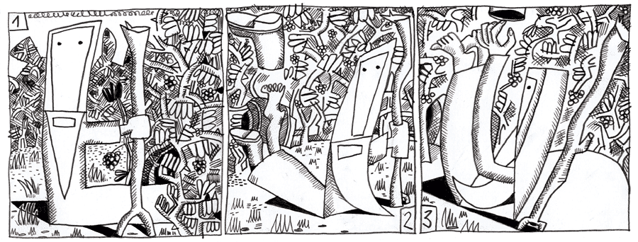 (104 / 281) Er gelangt auf eine kleine Lichtung, die von Beerenbüschen eingefasst ist. Ein ideales Versteck, das von außen nicht einsehbar ist. Halt, halt! Kaum hat er seine Beine aus der Röhre nachgezogen, da wollen seine Stiefel mit ihm davonfliegen. Der Aufenthalt im Schwerwasserbereich hat also auch Spät-Folgen. Der Reli muß sich von seinem zu leicht gewordenen Schuhzeug trennen. Bei dem sommerlichen Wetter scheint das kein Problem zu werden. |
