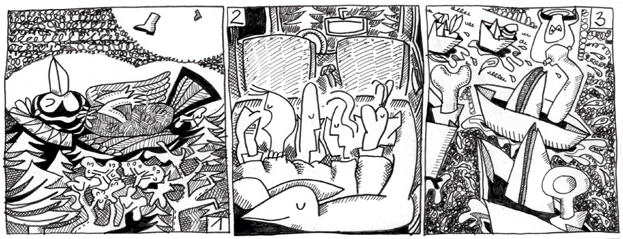 (106 / 281) Wer im letzten Bild hingesehen hat, erkannte, daß der Reli unter einer Schwamsel-Feder schläft. Kurz vorher hatte die Schwamsel ebenfalls geschlafen. Sie lag in den Baumkronen des schwebenden Waldes. Und hatte sich nicht träumen lassen, daß ihr ein Paar Stiefel entgegenschweben würden. Zwischen den Bäumen unter der Schwamsel schliefen die Everywener in ihrem Wagen. Liberty sorgte für Schlafkomfort. Zur gleichen Zeit jagen die Neuen und ihre Freunde durch den nächtlichen Himmel. In ihren Booten halten sie den Kurs, den der Strär berechnet hat. Aber wie lange wird der Schwall Veritas-Wasser tragen? Fasziniert blickt der Strär über Bord. Keine Spur mehr von dem Wasser zu sehen und trotzdem setzen die Boote mit unverminderter Geschwindigkeit ihre Fahrt fort. |
