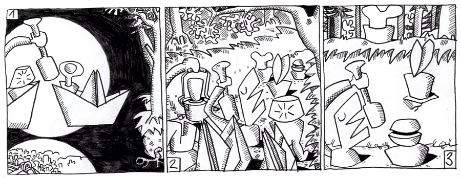 (111 / 281) By-Pass rudert mit geschlossenen Augen. Er schlafwandelt immernoch und passt sich den verschiedenen Situationen instinktiv an. Im ausgetrockneten Flussbett, das die Neuen und ihre Freunde ins Waldes-Innere führt, hält er mit den anderen Schritt. Man verlässt das Flußbett und klettert die Uferböschung hinauf. Das ist für Bypass überhaupt kein Problem. |