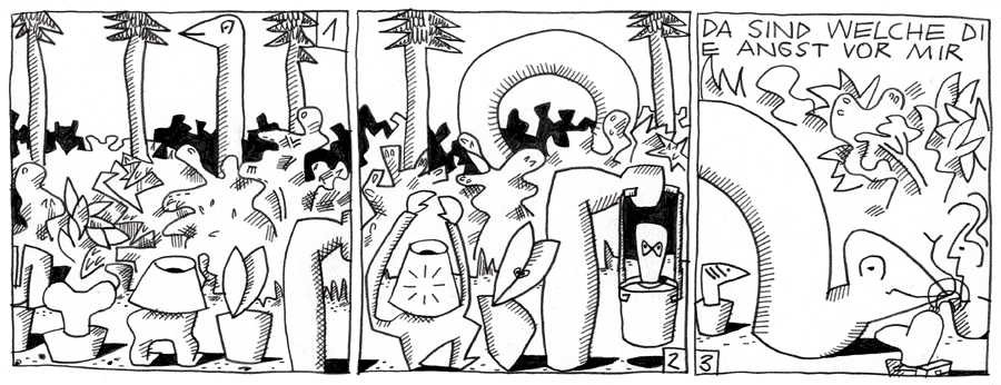 (113 / 281) Was steht da zwischen den Bäumen? Ein Ungeheuer! Die Neuen erschrecken und denken an Flucht. Selbst der Strär, der sonst die Ruhe in Person ist, verliert fast den Kopf. Liberty ist das peinlich. Traurig sagt sie zu den Kids: „Da sind welche, die Angst vor mir haben. Was soll ich machen?“ |