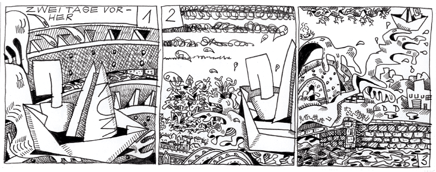 (115 / 281) Wo ist Melo? Auch wir wollen das wissen. Dazu ist es nötig zwei Tage zurückzugehen. Die Woge Veritas-Wasser stürzt aus dem Berg und reißt Melo mit. Ihm folgen der Wagen mit No-nein, Hier-wohne-ich und den Ältern. Zuletzt surft Hier-soll-es-schön-sein auf einer Scherbe hinterher. Während die anderen auf dem schwebenden Wald landen, schießt Melo auf seiner Woge unter dem großen Brücke-Bogen weiter. Hinter der Brücke gewinnt er schnell an Höhe und kann auf den Wald heruntersehen. |