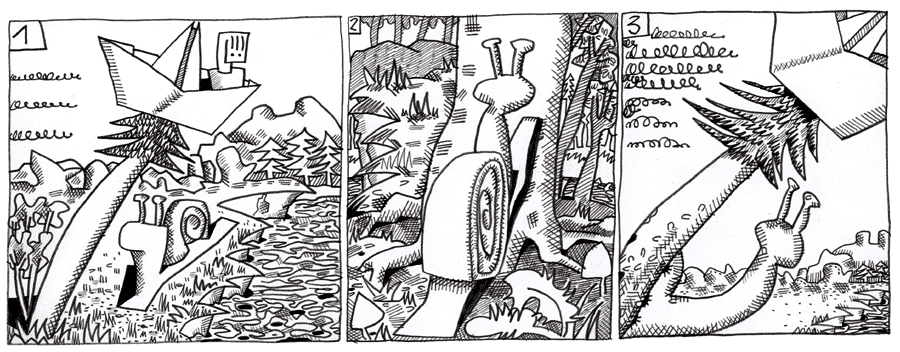 (119 / 281) Melo sieht über Bord. Er ist in der Luft gestrandet. Wie soll es weitergehen? Das alte Sprichtwort: „Kommt Zeit, kommt Rat!“ kommt ihm in den Sinn und stellt seinen Optimismus wieder her. Und da kommt sie ja auch schon, die Zeit, in Gestalt der Schnecke Tempo. |