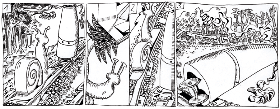 (121 / 281) Alles hat seine Zeit. Auch Sie Herr Strie! „Sie müssen die Schienen wechseln!“ legt ihm Tempos Schwester Mony nahe. „OK.“ sagt Herr Strie, aber so OK ist das bei seinem Alter garnicht. Er verliert das Gleichgewicht und stürzt die Böschung hinab. Wild greifen seine Rauch-Air-Ärmchen ins Leere. |