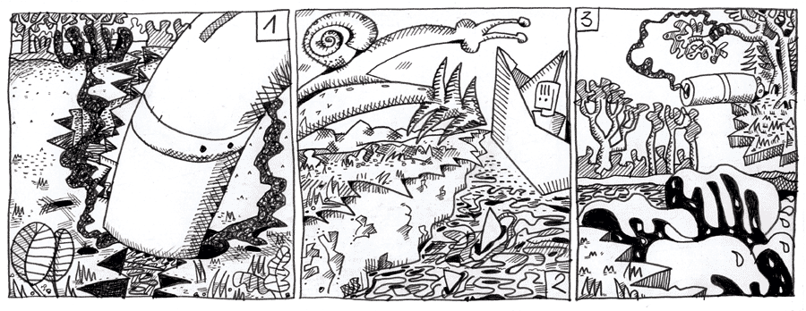 (122 / 281) Gut, daß Herr Strie hart im Nehmen ist. Er hat sich nichts getan, obgleich der Aufprall mehr als hart ist, wie Ihr seht. Die ganze Gegend bekommt einen Riss. Zum Teil liegt das auch an dem Trenn-Wasser-Prozeß, der immernoch anhält. Im Untergrund ist er bis ins feste Land hinein wirksam geworden. Da genügt ein kleiner Schlag, um ungeahnte Folgen hervorzurufen. Unweit von der neuen Bruchstelle harrt Melo im Baumwipfel aus. Auch hier reichen kleine Veränderungen der Schwerkraft-Verhältnisse. Melo fällt. Das in dem Augenblick, als ein Lachs unter ihm ist. Der Lachs schwimmt stromaufwärts. Dort sind große Veränderungen im Gang. Ein Stück der Au-Landschaft ist herausgebrochen und entführt Herrn Strie in die Lüfte. Die Bruchstelle ist tief. Sie saugt auch das Wasser aus dem Unterlauf des Flusses an. |