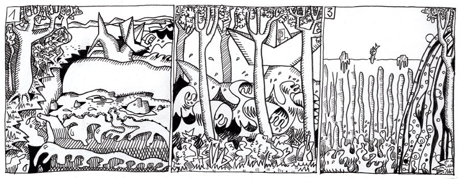 (124 / 281) Der Wasserlauf reißt auseiander. Eine unsichtbare Kraft zieht das Wasser bergauf, zieht es gegen die Neigung des Flussbettes an sich. Melo und der Lachs erleben einen wilden, hochaufschäumenden Wellenritt. Die Bäume auf der Uferböschung eilen vorbrüber. Im letzten Bild seht Ihr, wie Fisch und Kid die Bruchkante erreichen. Tief unter ihnen schäumt das Wasser auf. Der tiefe Krater, der vorher die schwebenden Wälder I und II enthalten hatte, ist ein Leicht-Kraft-Generator geworden. Was das bedeutet, könnt Ihr an der rechten Bildkante gerade noch erkennen. Dort wirbelt eine Säule aus den leichten Bestandteilen des Wassers in die Höhe. |