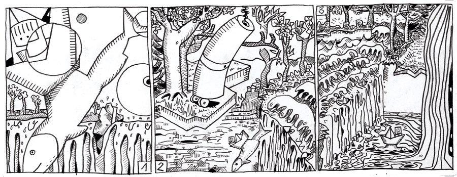 (125 / 281) Melo und der Lachs stürzen in die Tiefe. Zu den Laichplätzen wäre es, wie Ihr auf dem letzten Bild feststellen könnt, rechts neben dem Wasserfall weitergegangen. Aber der Sog in die neu entstandene Seenlandschaft ist zu stark, um partout an den alten Plänen festhalten zu wollen. Der bezaubernde Anblick der Wassersäule tut ein Übriges, um die Fahrtrichtung zu ändern. All das spielt sich unter den Augen von Herrn Strie ab, dessen Erdscholle zunehmend an Höhe gewinnt. |