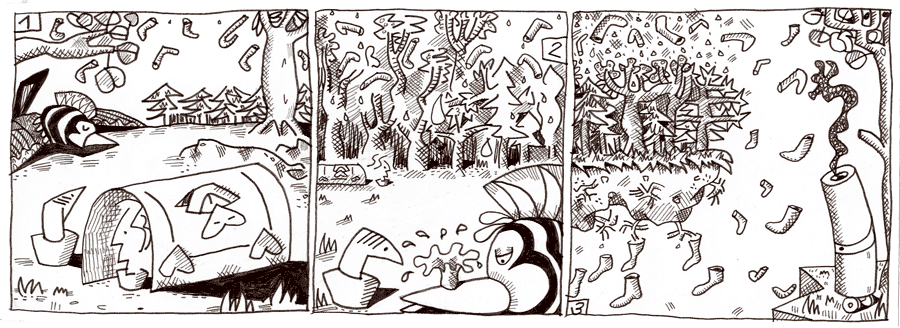 (130 / 281) Ohnmächtig liegt der Vogel am Boden. Die Kids kriechen aus ihrem Versteck und sehen nach. Am Himmel ist einiges in Bewegung. Dort fliegt nicht nur der Hirtenstab, eine Menge kleiner Stiefel zieht in bogenförmiger Bahn vorüber. Die Kids staunen. Regentropfen fallen zu Boden, ein dicker Tropfen trifft den Schnabel der Schwamsel. Dabei ist kein Wölkchen zu sehen. Der Vogel wird wach. Es sind die Stiefel, aus denen der Regen kommt, der jetzt immer dichter wird. Wie ist das möglich? Von dem Standpunkt aus, in den Herr Strie versetzt wurde, ist das leicht nachzuvollziehen. Die Stiefel befinden sich auf einer Umlaufbahn, die sich um den schwebenden Wald durch die Verschiebung der normalen Schwerkraftverhältnisse gebildet hat. Wie zu sehen ist, bildet sich gleichzeitig ein eigener Wasserkreislauf, nachdem der schwebende Wald vom allgemeinen Wasserkreislauf getrennt wurde. |