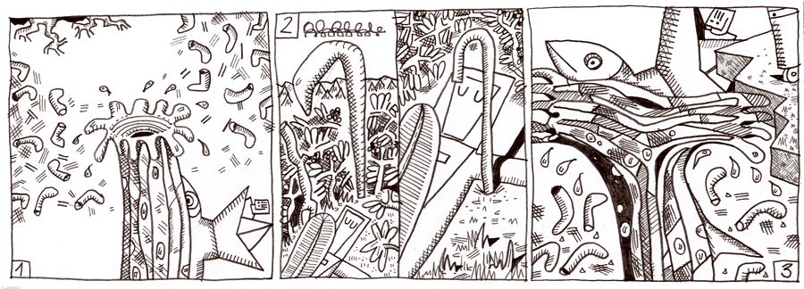 (132 / 281) Ihr schafft es! Bald haben Lachs und Melo den Gipfel der Wassersäule erreicht, die weiteren Höhen entgegenstrebt. Jetzt stößt sie auf Widerstand. Es ist der Stiefelchen-Ring, der sich um den schwebenden Wald Teil 1 gelegt hat. Der Ring bricht, die Formation der Stiefelchen löst sich auf, einzeln stürzen die Siefelchen ins Leere und vergießen die Flüssigkeit, die sie transportieren. Gleichzeitig erreicht Relis Hirtenstab die Erde. Wäre schade gewesen, wenn er nicht auf kürzestem Weg zu seinem Besitzer zurückgekehrt wäre. Reli schläft noch, als der Stab über ihm auftaucht. Ist es die Erschöpfung oder die zauberhafte Geborgenheit unter der Schwamselfeder, weswegen Relis Augen am späten Vormittag immer noch geschlossen sind? Auf der Schwebe-Wald-Ebene ist umsomehr los. Die Wassersäule hat die Höhe beider Waldteile erreicht und ist in deren Schwerkraftfelder vorgestoßen. Unter dem Zugriff ihrer beider Anziehungskräfte spaltet sie sich. „Alle Achtung!“ denkt Herr Strie, als er Melo und den Lachs aus dem Wirbelwasser auftauchen sieht. |