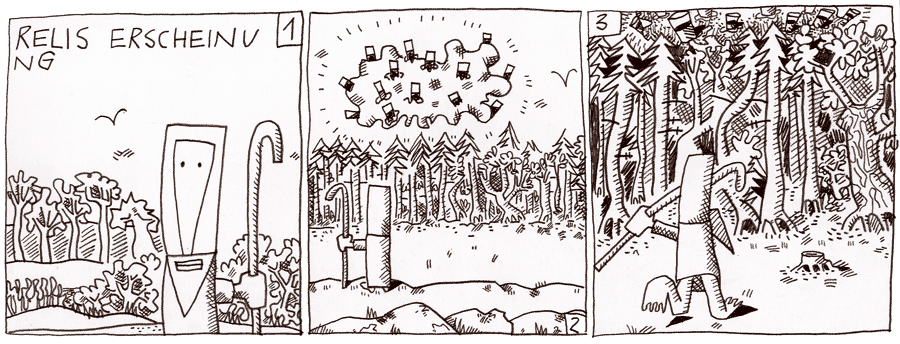 (145 / 281) Tatsächlich! Kaum hat er ein Stück flußaufwärts, wo das Beerendickicht endet, die Uferböschung erklommen, sieht er etwas, das bisher noch kein Everywener erblickt hat. „Was ist das?“ und wie ein Blitz durchzuckt ihn auch schon die Erkenntnis: „Vierzehn Halbe!“ Er braucht nicht zu zählen. Zählt nach, Kinder, es stimmt! Über dem Wald schwebt eine Wolke mit halbvollen Gefäßen, vierzehn halbvollen Gefäßen, deren Herkunft wir mit den Ereignissen um den schwebenden Wald in Verbindung zu bringen. Das Ziel seiner Wanderung scheint zum Greifen nahe, wenn das nur keine Fata Morgana ist. Der Reli eilt auf die Erscheinung zu. Diese sinkt zwischen die Baumwipfel. |