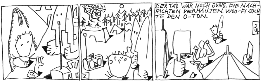| (9 / 15) Es war ein strahlender Sommertag. Aber unter den Lagerbewohnern herrschte angespannte Stille. Alle warteten auf die Nachrichten im Radio. Am lautesten war der Hubschrauber, der immerwieder vorüberfolg. Großer Jubel brach aus: „Heute haben Fabrikgegner den Bauplatz im WAA –Wald besetzt... „ verkündete die Radiostimme aller Welt. Jetzt gab es für Woo-Fi kein Halten mehr. Er wollte dem Kind den Nabel der Welt zeigen. |