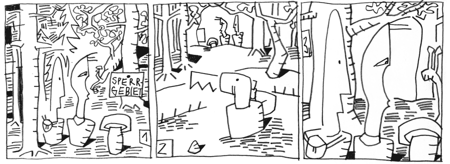 | (14 / 56) Auch Vulkana und Woo-Fi erreichen den Rand des Sperrgebietes, wo sie das Verbotsschild aufhält. Sie gestikulieren und rufen. Der Wergler, der sich in seiner Arbeit gestört fühlt, möchte wissen, was los ist, und schickt die Schneckenpost. |