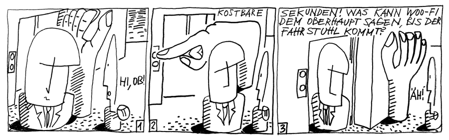| (14 / 37) Noch vor der Sitzung begegnet Woo-Fi dem Stadtoberhaupt, das auch „der Ober“, oder nur „der OB“ genannt wird, und erkennt die Chance. Der Ober ist aber in Begleitung der Öffentlichen Hand. Sie warten auf den Fahrstuhl. Woo-Fi will sagen: Nur kurz, auf ein Wort! Er holt tief Luft und sagt: „Hi, OB!“ und fürchtet, schon zuviel gesagt zu haben. |