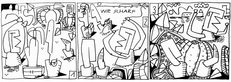 | (14 / 32) Man kann kaum anders, als Angst vor Bypass haben. Er ist unberechenbar. Er demonstriert an dem Haar, das im Sonnenlicht glänzt, wie scharf sein Profil ist. Messerscharf. Vor seiner Denkerstirn gehen Woo-Fi und Hier-wohne-ich fluchtartig auf Distanz. Ebenso No-nein, sie klettert zu Melo auf den Kürbis. Die beiden können sehen, wie Bypass in Tränen ausbricht. Was ist nur mit dem los? |