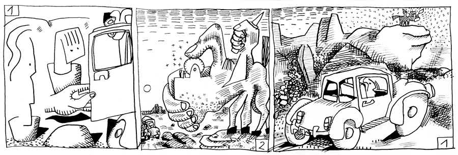 | (12 / 92) Über der Wüste, in der die Mädchen verschwunden sind, bricht die Nacht herein. Hier-soll-es-schön-sein und Melo beraten, wer den Wagen weiterfährt. Melo setzt sich hinter das Steuer. Auf einem Felsvorsprung in der Ferne blitzt ein Licht auf. Es ist ein Signal der Megascheli, der fünfarmigen Vorboten der Verfehlung, die im Auftrag der Höheren Gewalt dafür zu sorgen hat, daß Messer, Gabel, Schere und Licht nicht in falsche Hände geraten. |