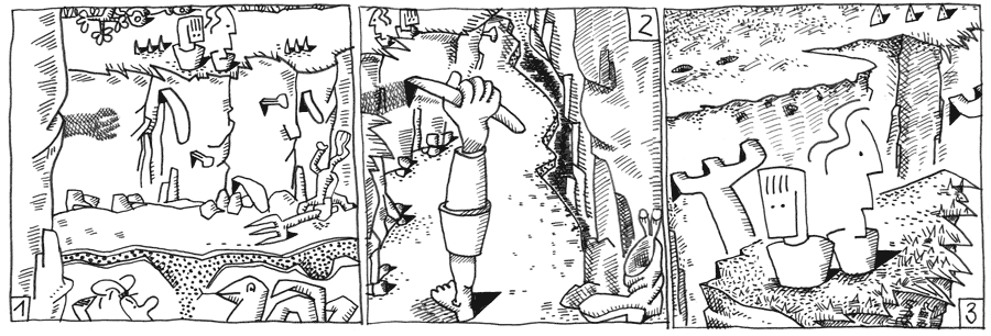| (15 / 92) Vor dem erstaunten Blick der Jungen zieht in der Schlucht auch noch ein Elf vorüber. Er nimmt sich eine Gabel. Kurz danach kommt ein Fasst-Fussler, wie er im Buche steht - in Wirklichkeit hatten sie noch nie einen gesehen - , und beginnt an dem Gabelgriff zu hebeln, der unter ihnen aus der Schluchtwand ragt. Ist das nicht verboten? Der Vorsprung, auf dem die beiden stehen, bricht ab. |