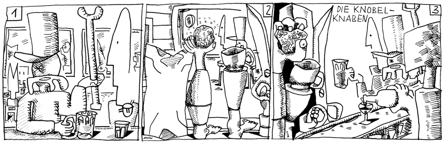 | (29 / 92) Lehmget Walter und Woo-Fi stehen am Tresen und trinken etwas. Alles ist friedlich. Sie hören die Türe gehen. Das ist ja seltener Besuch, ruft der Wirt den Neu-Eintretenden entgegen. Es sind ein Blatt Papier, ein Stein, eine Schere und ein Gefäß, kurzum: Die Knobel-Knaben. „Die Knobel-Knaben!“ geht ein Geraune von Tisch zu Tisch. Wie man sieht, sind sie mit den Fasst-Fusslern verwandt. Sie stellen sich neben Lehmget Walter und Woo-Fi und bestellen Bier. Alles hält den Atem an. |
