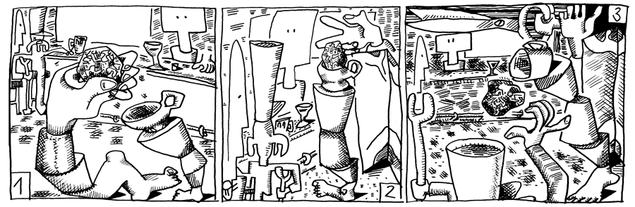| (30 / 92) Das falsche Wort, das den Streit vom Zaun bricht, stammt von den Knobelknaben selber. Schon knobeln sie. Der Stein fliegt durch die Luft, das Papier weicht der Schere aus und versucht das Gefäss abzudecken. Dass Lehmget Walter, der schon an so mancher Schlägerei beteiligt gewesen war, fühlt sich in seine Jugend zurückversetzt. Er gibt eine Lokalrunde aus. |