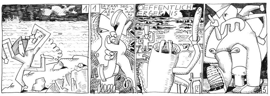 | (39 / 92) Gerade wollen Sie den Hörer auflegen, da vernehmen sie den SeS-Funk. Offenbar haben es die Staatsstiefel mit einem Öffentlichen Ärgernis zu tun. Da wär ein alter Mann am Meer, der nicht weitergehen will. Der Staatsstiefel, der soeben nocht ergebnislos Hier-soll-es-schön-sein verfolgt hatte, nimmt jetzt Kapitän Lehmgeht Walter fest. |