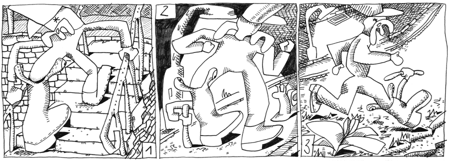 | (41 / 92) Folgen Sie mir unauffällig, ordnet der Staatsstiefel an. Lehmgeht Walter tut, was ihm befohlen wird, ist er doch froh, aus seiner Bewegungslosigkeit befreit zu sein. Unterweges ist nicht mehr ganz klar, wer wen zu führen hat. Der Staatsstiefel wankt und braucht eine Stütze. Lehmgeht Walter erfasst die Situation und zieht nüchtern seinen eigenen Nutzen daraus. Das neue Gehwerkzeug passt wie angegossen. Er muß sein Boot wieder kriegen. |