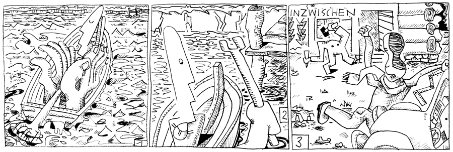| (43 / 92) Es ist fast schon Mittag als der erschöpfte Woo-Fi in der Ostsee nahe der Küste aufwacht. Ein Bootssteg. Er steuert drauf hin. Nicht weit davon entfernt verabschiedet man sich. Mamau schwenkt voller Tatendrang sein Bildhauerwerkzeug. Mies und Wies und die Kids müssen weiter. Wie gerne hätten die KidsVulkana angerufen, um ihr zu sagen, daß es ihnen gut geht. Aber auch Mamau hat weder Festnetz-Telefon noch Handy. Wies gibt Gas. Vielleicht gibt es ja auf der Baustelle ein Telefon. |