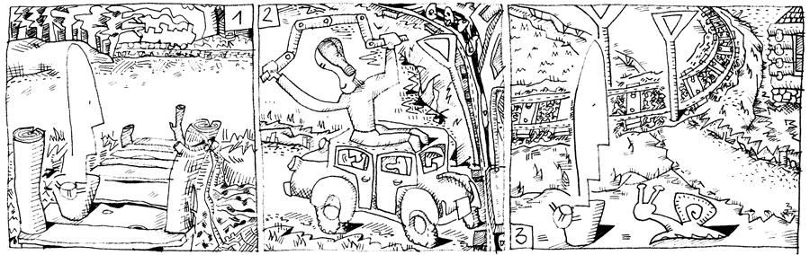 | (44 / 92) Woo-Fi hat den Bootssteg an der Ostseeküste betreten. Vor ihm liegt eine Ebene, die ihn an seine Kindheit erinnert. Aber wo bin ich wirklich? Am Ende der Wiese fährt eine Eisenbahn vorüber. Hinter dem Bahndamm sieht er eine Blockhütte. Um wenige Augenblicke nur hat er die Kids verpasst, die schon wieder mit Mies und Wies zu neuen Abenteuern unterwegs sind. |