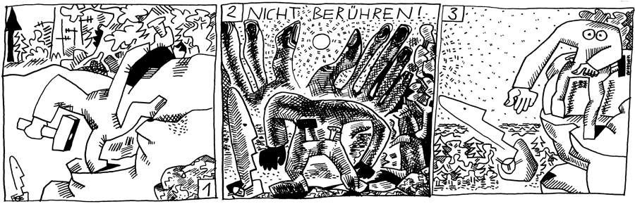 | (47 / 92) Mamau lädt Woo-Fi ein, den Steinbruch auf dem Monte Kaho zu besichtigen. Er klettert im Licht des Sonnenunterganges voran. Oben angekommen will er seinem Gast die Hand reichen, um ihm hinaufzuhelfen. Doch Woo-Fi wird von finsteren Befürchtungen bewegt. Er weicht der Hand aus und verliert das Gleichgewicht. Er stürzt ab. |