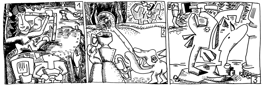 | (50 / 92) Wies sitzt am Steuer. Der Wagen donnert der Baustelle entgegen. Der Megascheli zuckert etwas nach. Dann dürfen die Fasst-Fuzzler weiter. Splitter fliegen durch die Luft. Mit einem kühnen Schlag teilt Mamau den Stein in zwei Teile. Woo-Fi ist wieder er selber. Er kann ans Weitergehen denken. Zuletzt hatte er Lehmget Walters Boot retten wollen. |