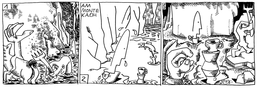 | (56 / 92) Man rettet sich vor der weitersteigenden Flut den Berg hinauf. Knobelknaben und Fasst-Fuzzler kommen nach. Was die Verwendung von Messer, Gabel, Schere und Licht anbelangt, ist Anarchie ausgebrochen. Jeder ist vom anderen entsetzt, wie dieser das Besteck hält. Wie weit das führen kann, soll Woo-Fi gleich erleben. |