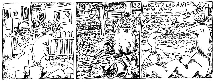 | (62 / 92) Vulkana und Hier-soll-es-schön-sein machen sich auf den Weg in den Hafen, wo demnächst der Wandervulkan einlaufen wird. Wie sollen sie das noch rechtzeitig schaffen! Glücklicherweise liegt Liberty auf dem Weg und nimmt ein Staub-und Sonnenbad. Auf Libertys Rücken gelangen sie schnell an die Klippen, von wo aus sie die Ankunft des Wandervulkans beobachten können. |