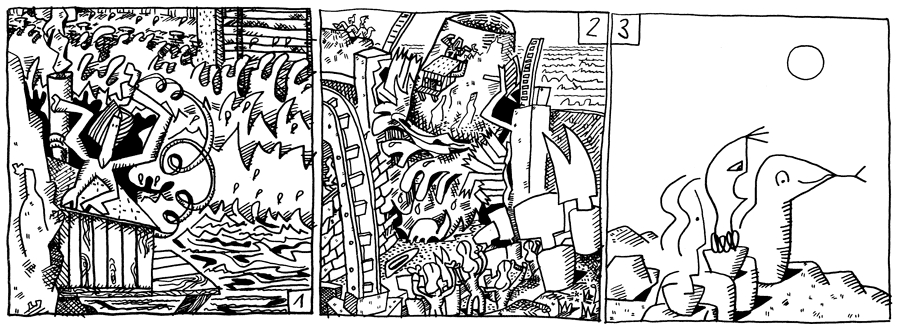 | (63 / 92) Mit unverminderter Geschwindigkeit nähert sich Litta auf einer Springflut der Flutkanalschleuse. Unter dem Entsetzendsschrei der versammelten Everywener durchbricht der Wandervulkan das Tor. Die Wassermassen des Meeres ergießen sich in das leere Kanalbecken. |