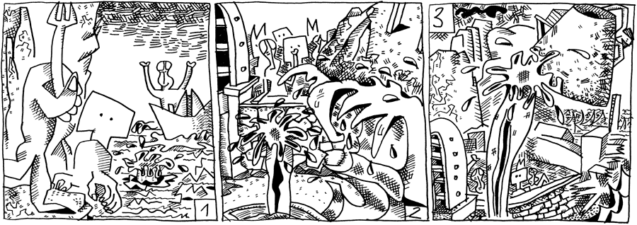 | (67 / 92) Hurra! rufen die Streithähne, die sich alle auf den Monte Kaho zurückgezogen hatten. Sie verlassen den Berg und haben jetzt wieder mehr Platz für ihre Auseinandersetzungen. Inzwischen ist der Wandervulkan in Everywen angekommen und auf seiner kolossalen Welle in den Flutkanal eingefahren. Ein weiterer Aufschrei. Plötzlich kehr das Wasser aus dem Riss im Kanalgrund zurück und schiebt den Wandervulkan ins Meer zurück. |