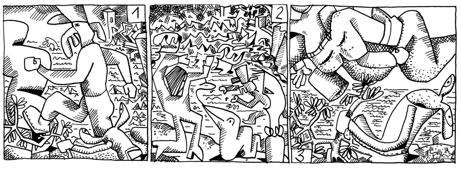 | (69 / 92) In letzter Sekunde erreicht Lehmget Walter die Klippe. Der Wandervulkan legt gerade ab. Mit einem gewaltigen Satz springt der Kapitätn der Schlange Liberty hinterher, die ihren Körper als Gangway zur Verfügung gestellt hatte. Der Staatsstiefel allerdings hat ebenfalls seine Chance erkannt und hält sich an einem Ast fest. |