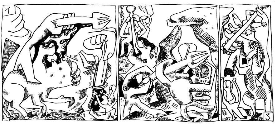 | (72 / 92) Im Trockenen streitet es sich doch besser. Allerdings muß man aufpassen, daß man nicht abstürzt. Die Parteien stehen sich unversöhnlich gegenüber. Sie versuchen sich Messer ,Gabel, Schere und Licht aus den Händen zu reissen, um der vermeintlich mißbräuchlichen Art, in der sie der Gegner verwendet, ein Ende zu bereiten. So geht das! Und nicht so! Zwischen den Felsen hallen die Maßregelungen wieder. |